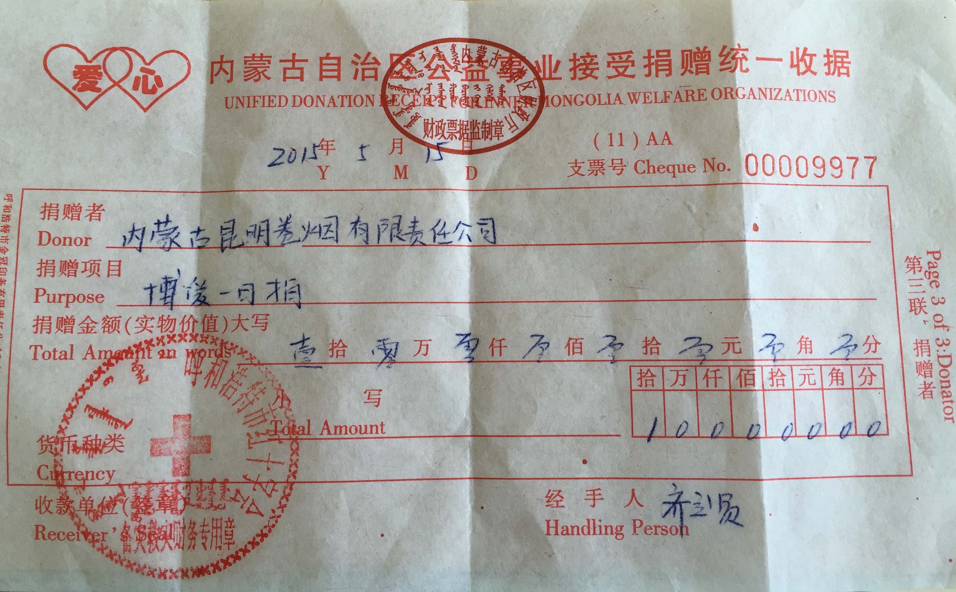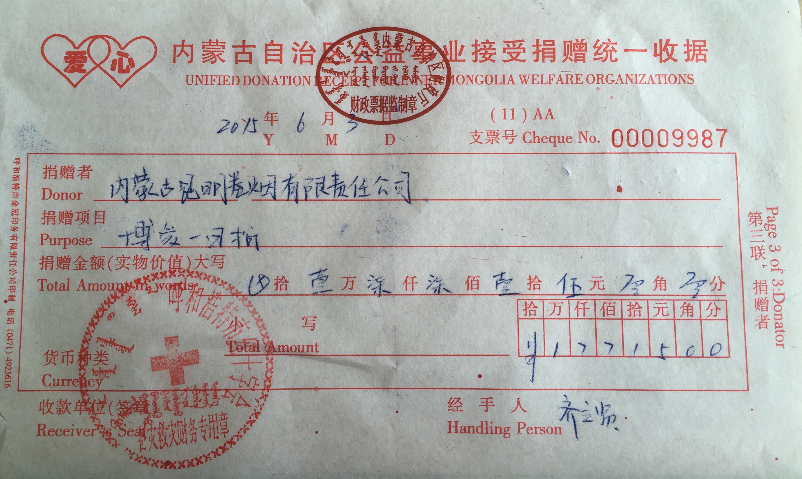 5月,蒙昆公司響應(yīng)呼和浩特市紅十字會(huì)號(hào)召,在公司內(nèi)開(kāi)展了“博愛(ài)一日捐”募捐活動(dòng)。公司向市紅十字會(huì)捐款10萬(wàn)元,員工也積極響應(yīng)該活動(dòng),踴躍捐款,共捐款17715元。